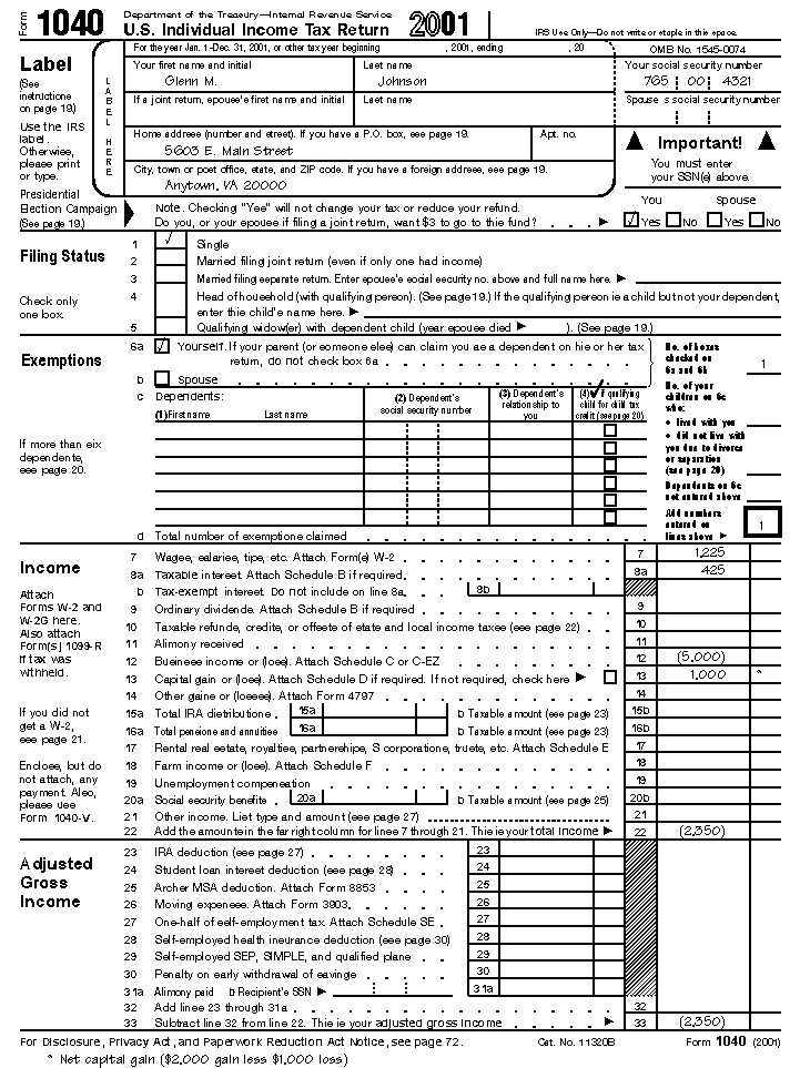Glenn Johnson is in the retail record business. He is single and has the following income and deductions on his Form 1040 for 2001.